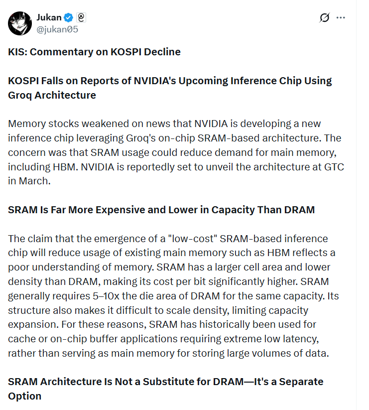 最近一则英伟达的传闻也扰动了韩股。英伟达被曝开发基于Groq片上SRAM架构的推理芯片,投资者担忧SRAM的使用会减少对包括HBM在内的主内存的需求。但机构分析KIS直指市场误读:SRAM并非HBM/DRAM替代品,而是面向超低延迟场景的差异化选择,内存层级细分将最终扩大整个行业总量。