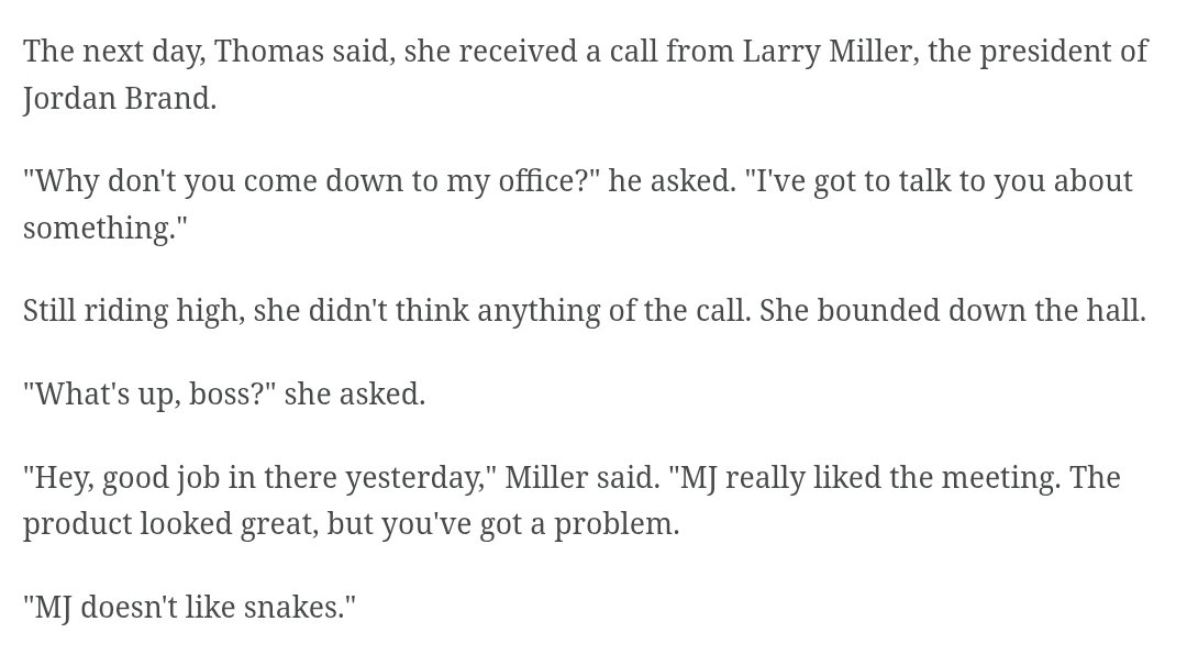 但就在方案即将落地时,Jordan Brand总裁告知团队一个关键问题——乔丹害怕蛇。